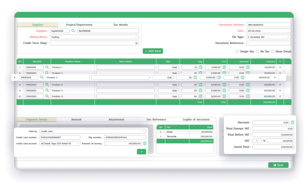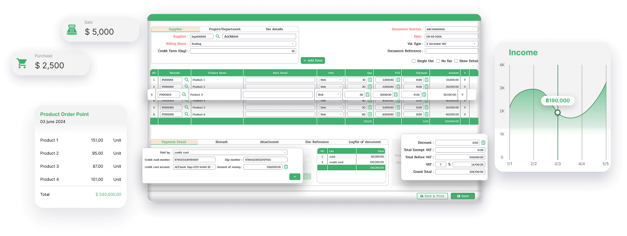 ระบบจัดการกระบวนการสั่งซื้อสินค้า ตั้งแต่การขอซื้อ การออกใบสั่งซื้อ ไปจนถึงการรับสินค้าเข้าคลัง พร้อมบันทึกข้อมูลต้นทุนอย่างเป็นระบบ